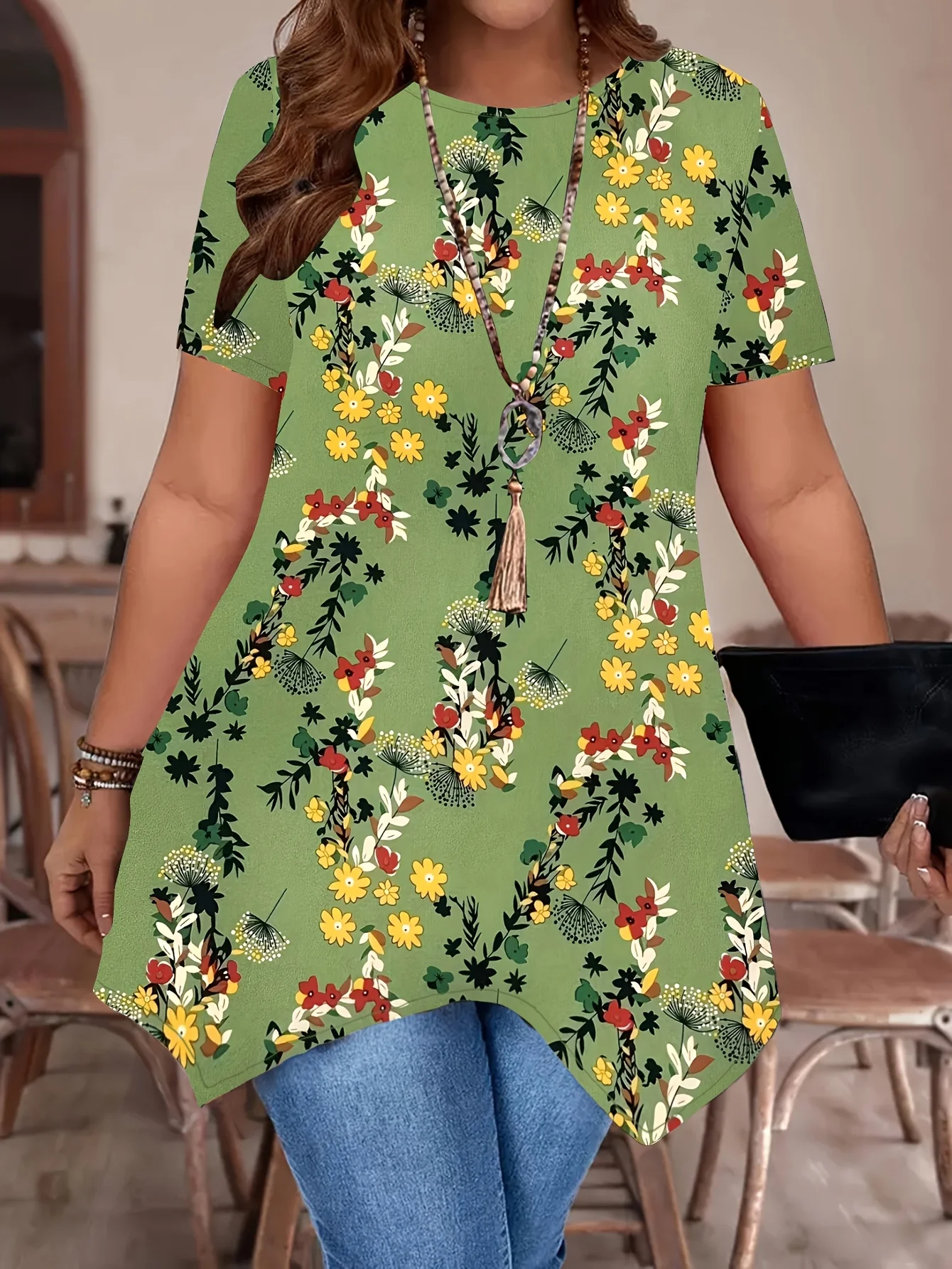 Plus size top geometric print irregular hem short sleeve round neck shirt light and breathable fabric elegant casual fashion