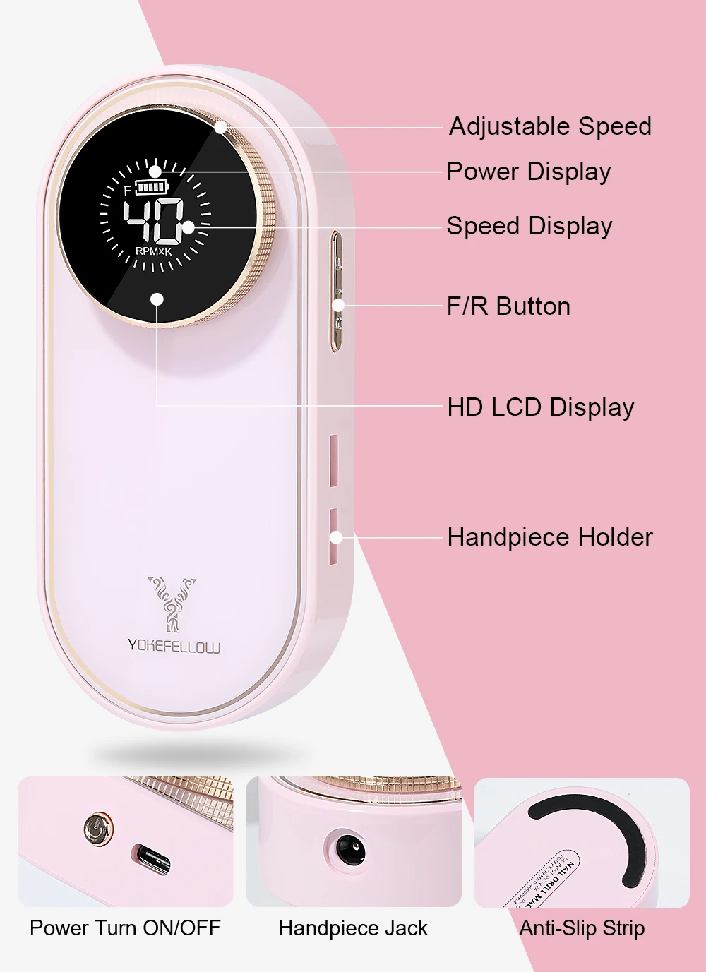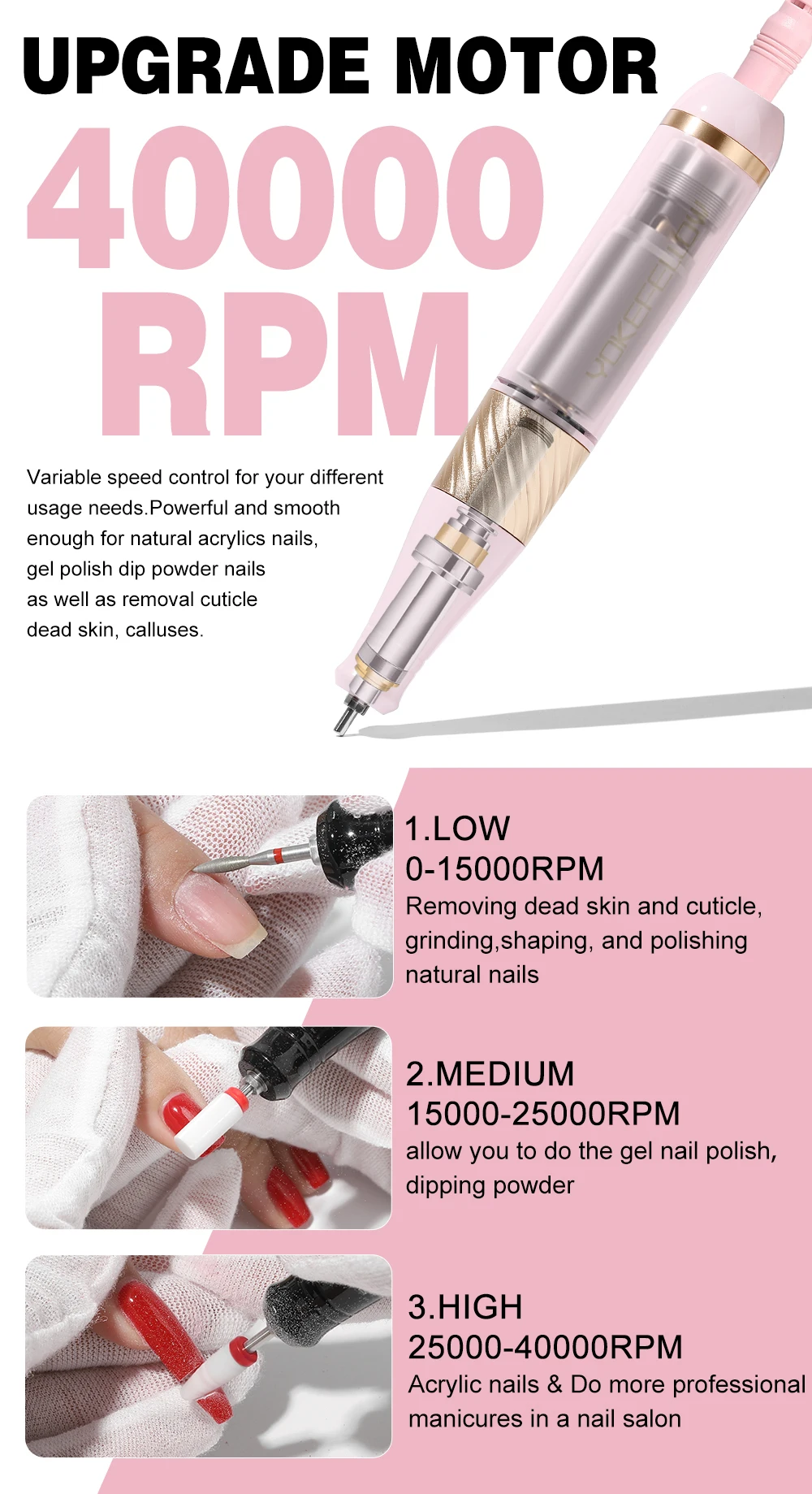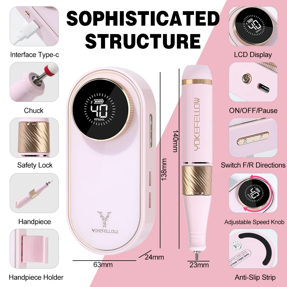 YOKEFELLOW Professional Nail Drill 40000RPM Rechargeable Electric Nail Drill Machine Cordless Nail E File for Acrylic Gel Nails