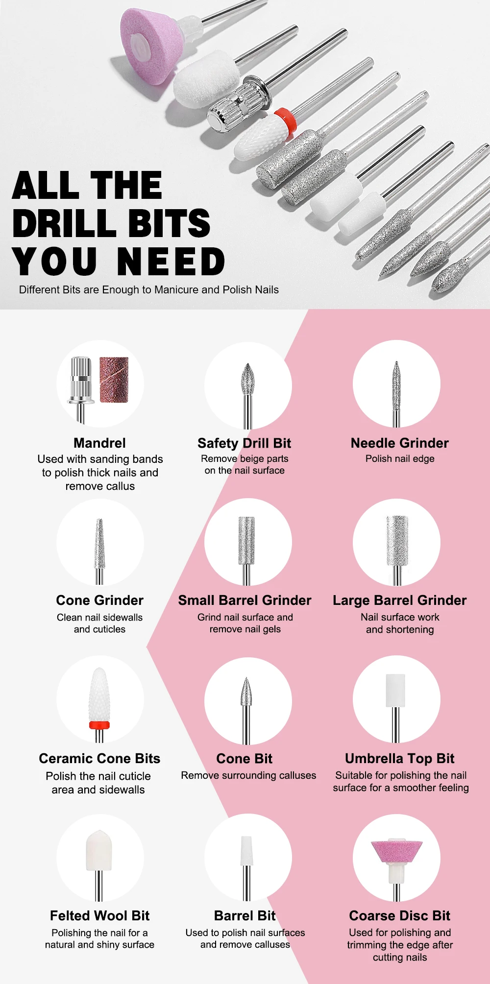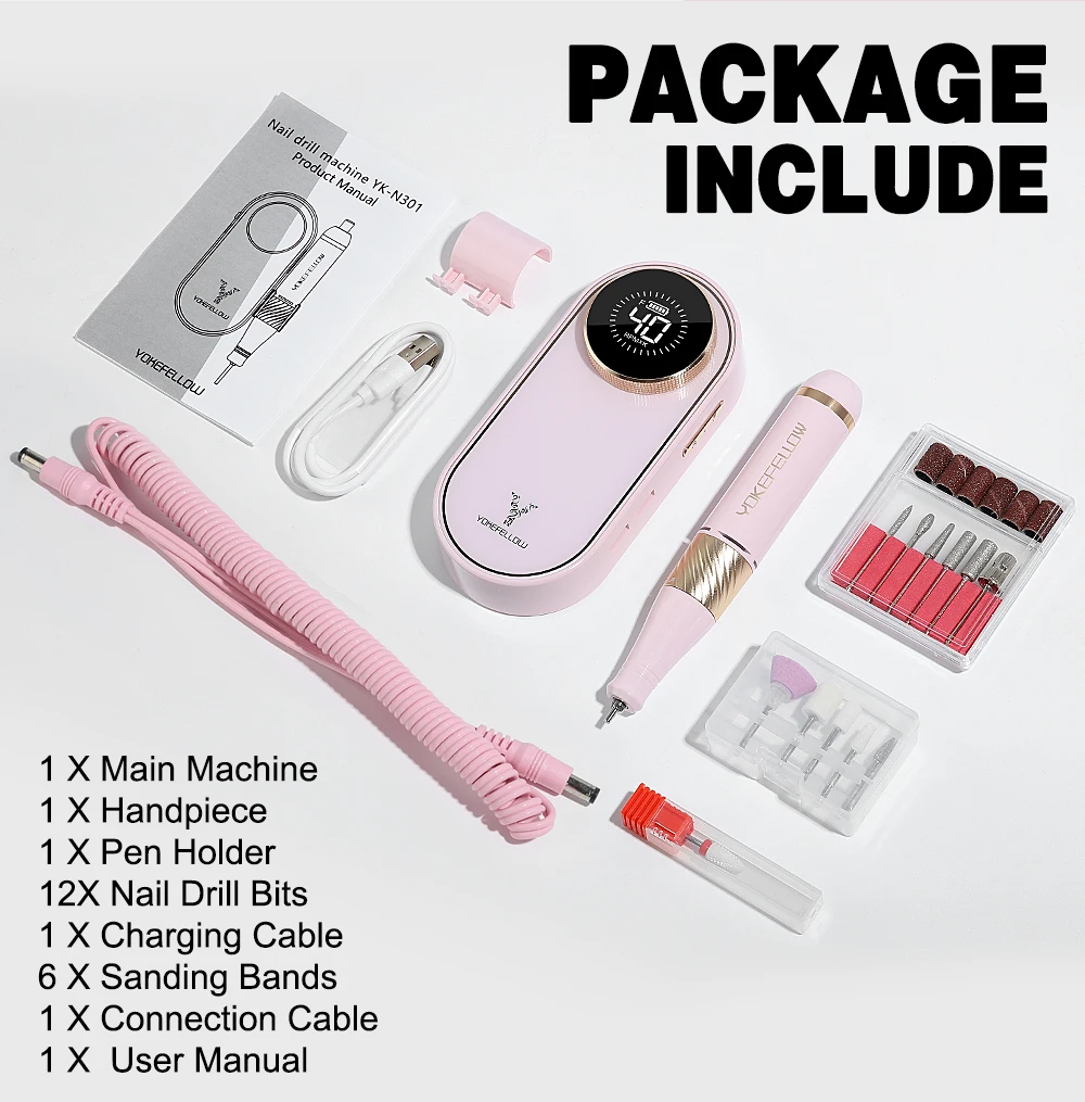 【Multi-functional Nail Drill Kit】: Our portable nail drill is truly a must-have for every nail care enthusiast. This nail drill kit comes with 12 nail drill bits and 6 sanding bands for different usage. Whether you're a professional nail technician or someone who loves doing your nails at home, our Professional Portable Electric Nail Drill is here to enhance your nail care routine.